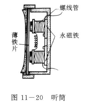 在电话的听筒里有一个永磁铁,它的两个磁极上套着螺钱管,在磁极前面有一个薄铁片,如图11-20所示。由于永磁体的吸引,薄铁片有些弯向磁极。在电话接通时,听筒是和对方的话筒串联在一个电路里的,当从话筒传来按说话声音的振动两强弱变化的电流时,磁体对铁片的吸引力也发生强弱变化,使铁片振动起来,发出和对方说话相同的声音。