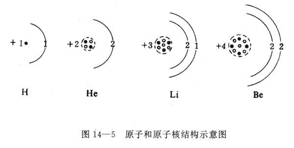 氢(H)原子核的结构最简单,氢原子该就是质子,该外有一个电子.氧(He由)原子核由两个质子和两个中子组成,核外有两个电子。锂(Li)原子该由三个质子和四个中子组成,核外有三个电子。铍(Be)原子核由四个质子和五个中子组成,该外有四个电子,等等(图14-5)